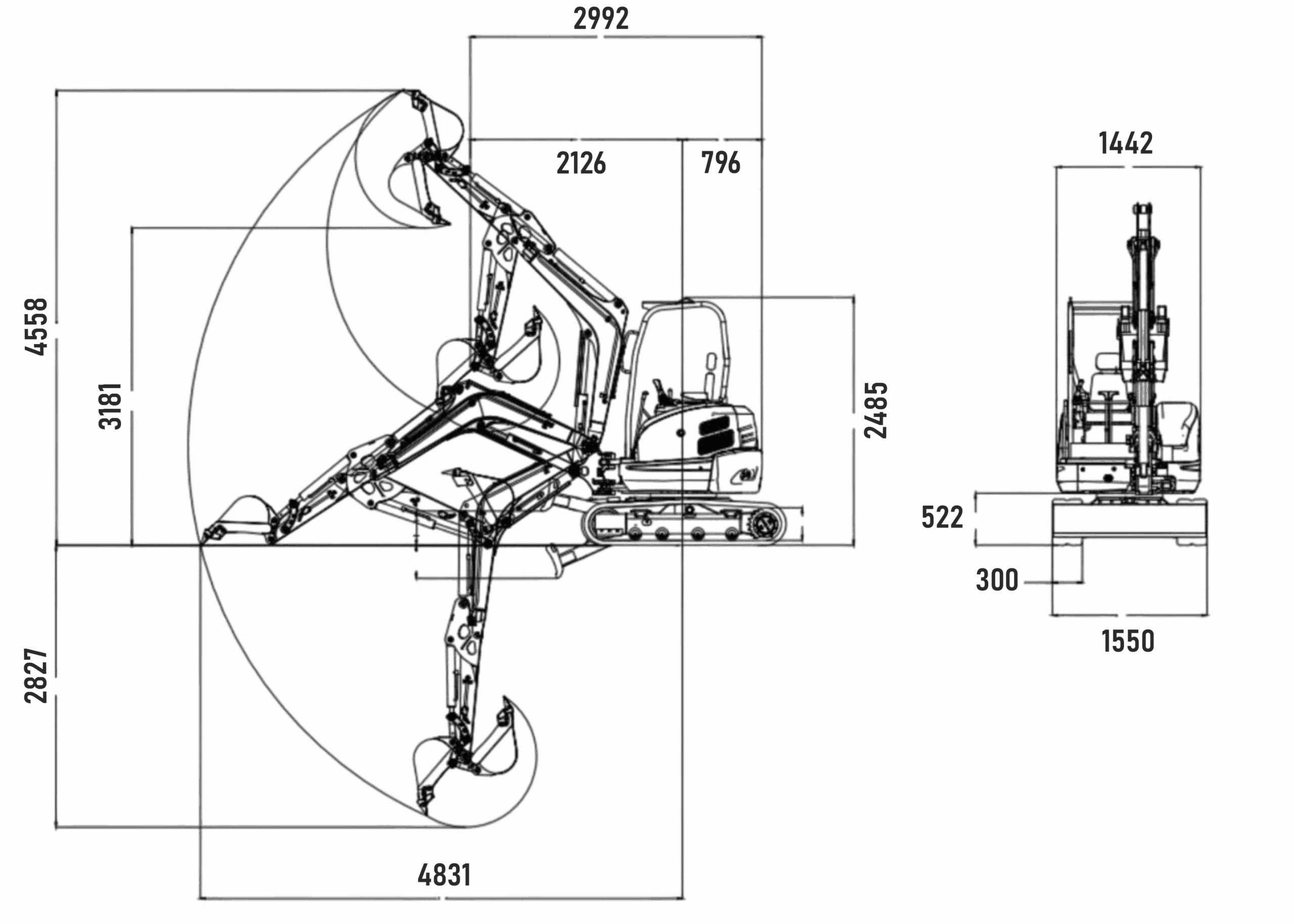 Maximum digging depth of 2827 mm, digging radius of 4831 mm, and digging force of 27 kN. Maximum dumping height is 3181 mm, suitable for loading at greater heights.