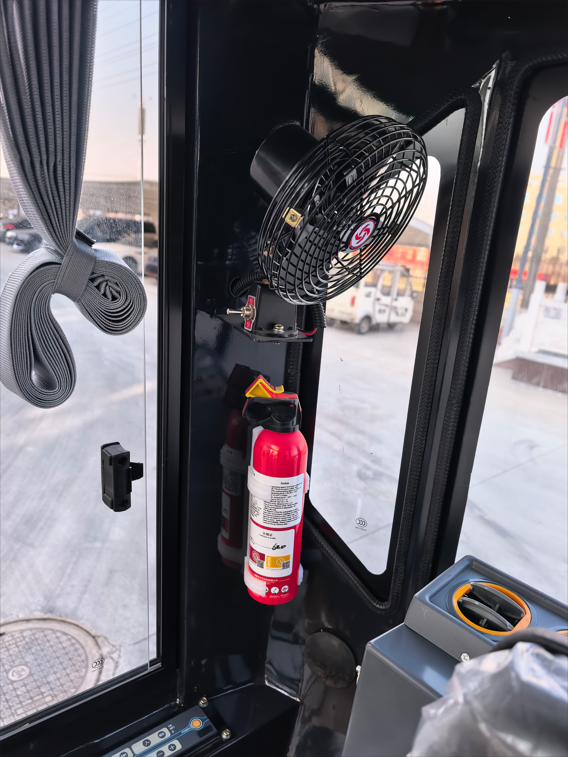 De draaibare arm kan 75° naar links en 45° naar rechts uitslaan, wat de operationele veelzijdigheid vergroot. De cabine heeft een hoogte van 2270 mm en biedt de operator goed zicht en comfort tijdens het werk.