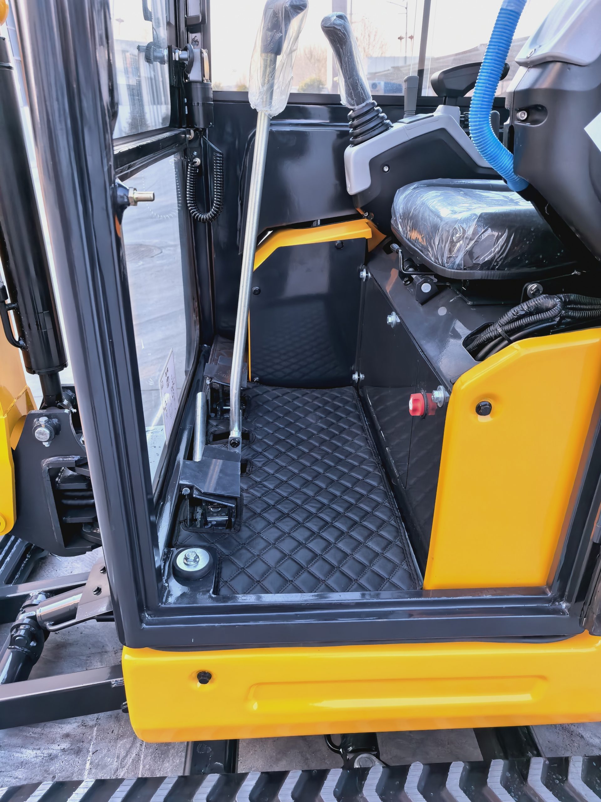 Het rupsonderstel is 820 mm breed met een minimale bodemvrijheid van 210 mm, wat stabiliteit biedt. De bodemvrijheid van het bulldozerblad bedraagt 230 mm en de maximale graafdiepte 275 mm, wat een veilige werking op oneffen terrein ondersteunt.